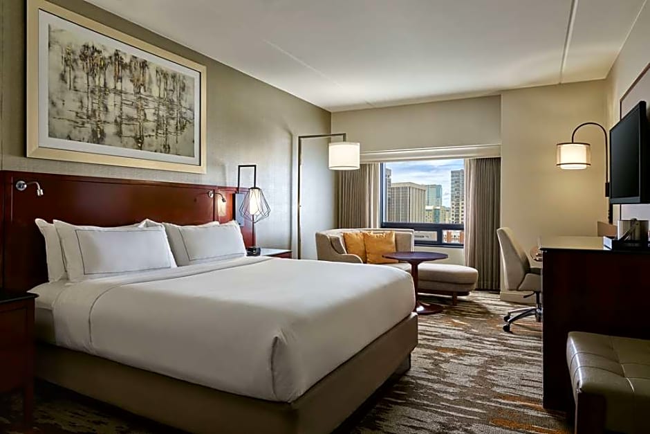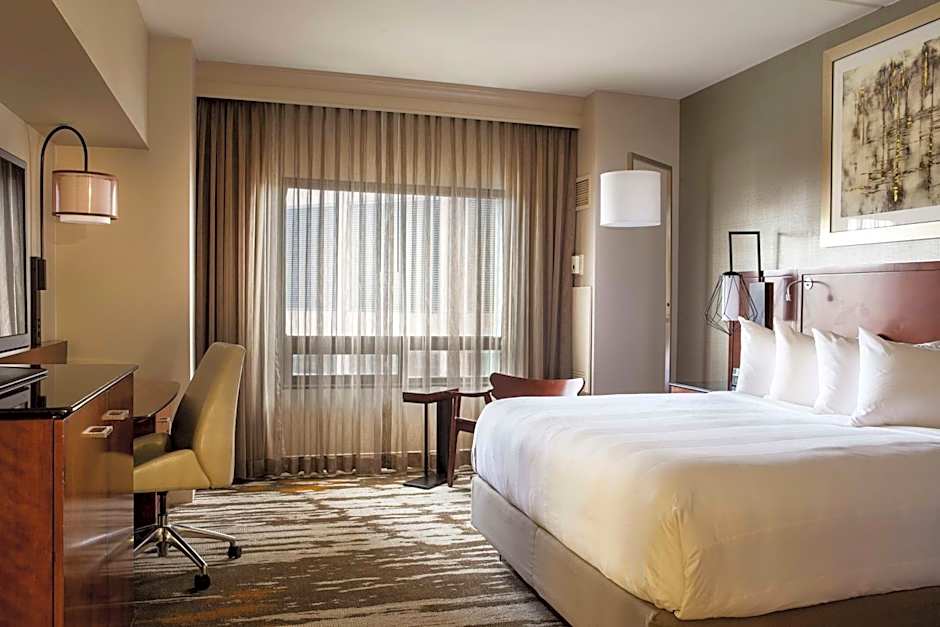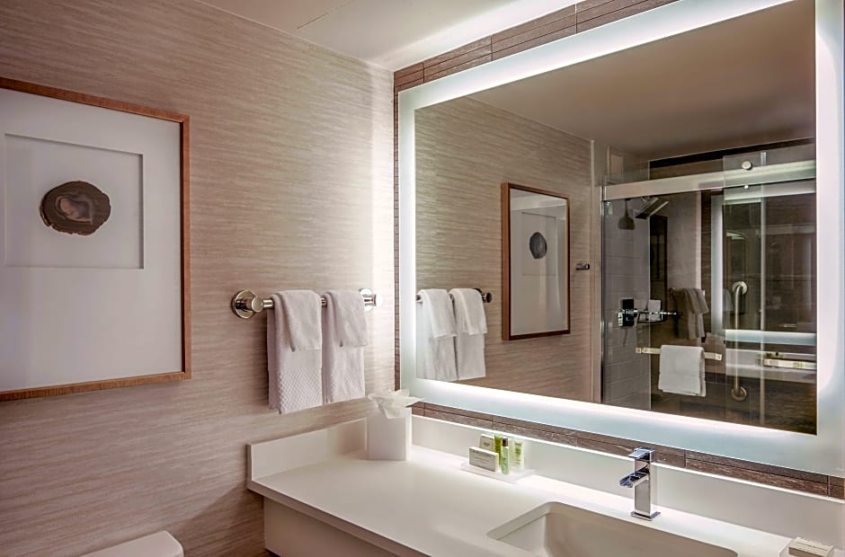 This spacious corner room has a desk and ergonomic chair. Located on a higher floor with city views, features include a flat-screen TV, Bluetooth speaker, and work desk with ergonomic chair.