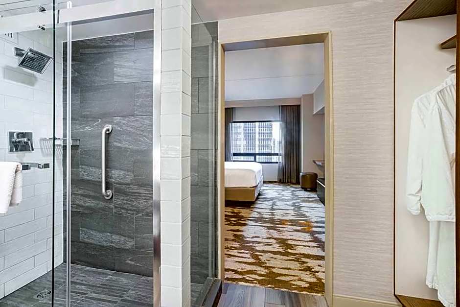 This mobility accessible room features a 3 x 3 transfer shower. Any corresponding photo may not reflect the specific accessible room type. Room features include a flat-screen TV and work desk with ergonomic chair.