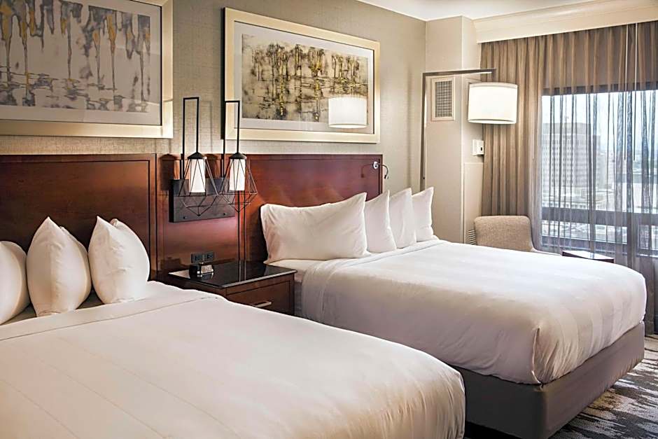 This double queen room has a desk and ergonomic chair. Features include a flat-screen 42-inch TV and Bluetooth speaker.